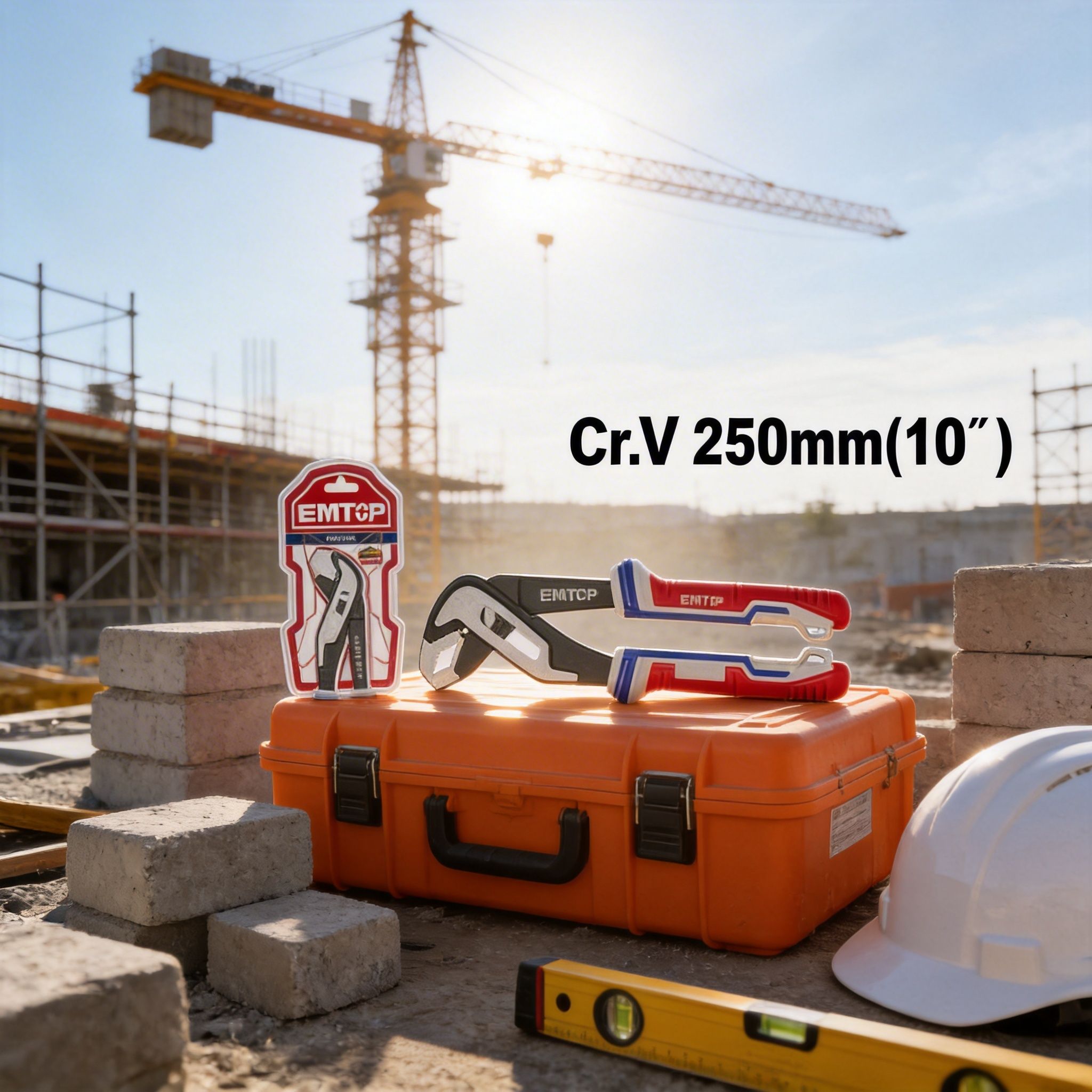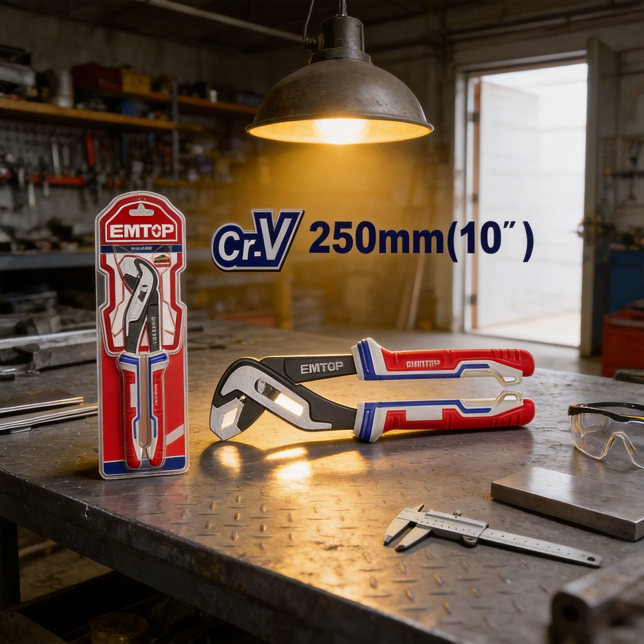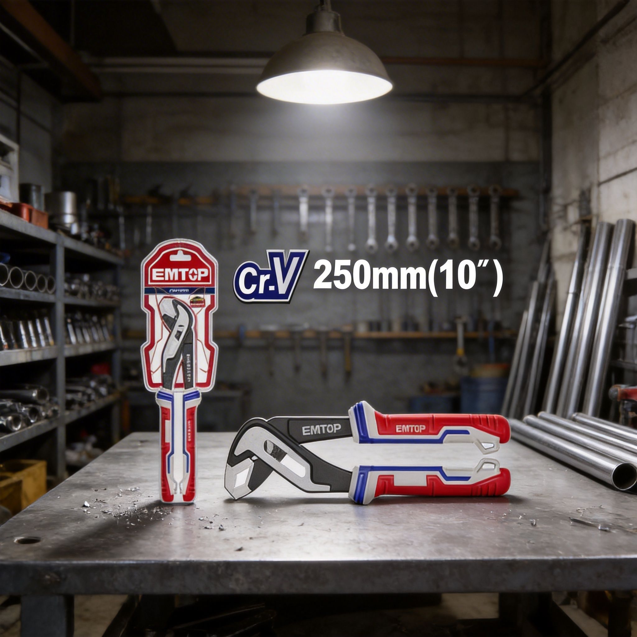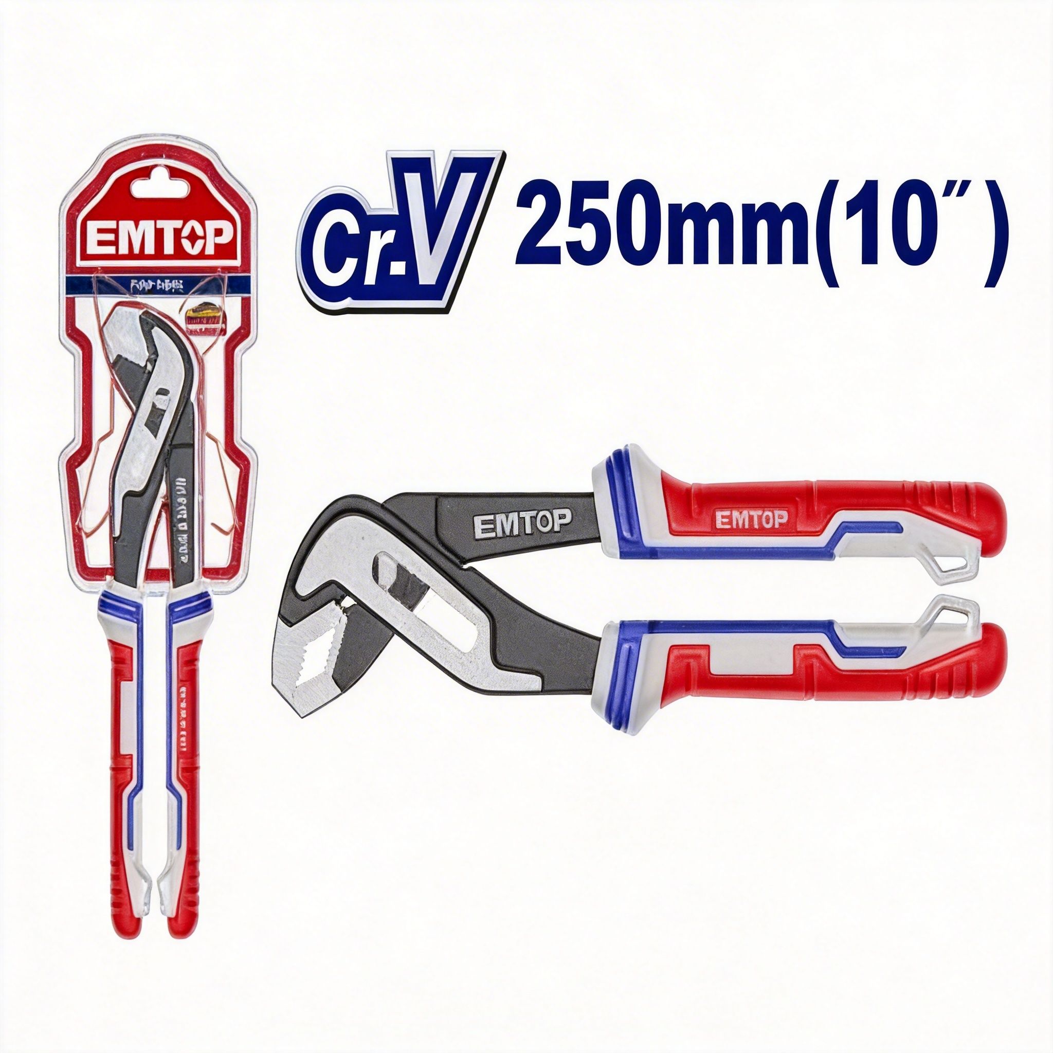 Alicates para bombas EMTOP de 250 mm (10″), también conocidos como pico de loro, ideales para trabajos de agarre, ajuste y manipulación de piezas en tareas de instalación, mantenimiento y reparación. Son una herramienta muy útil para sujetar tubos, tuercas, conexiones, accesorios y diferentes piezas de distintos tamaños, ofreciendo mayor versatilidad en trabajos de ferretería, plomería y uso general.