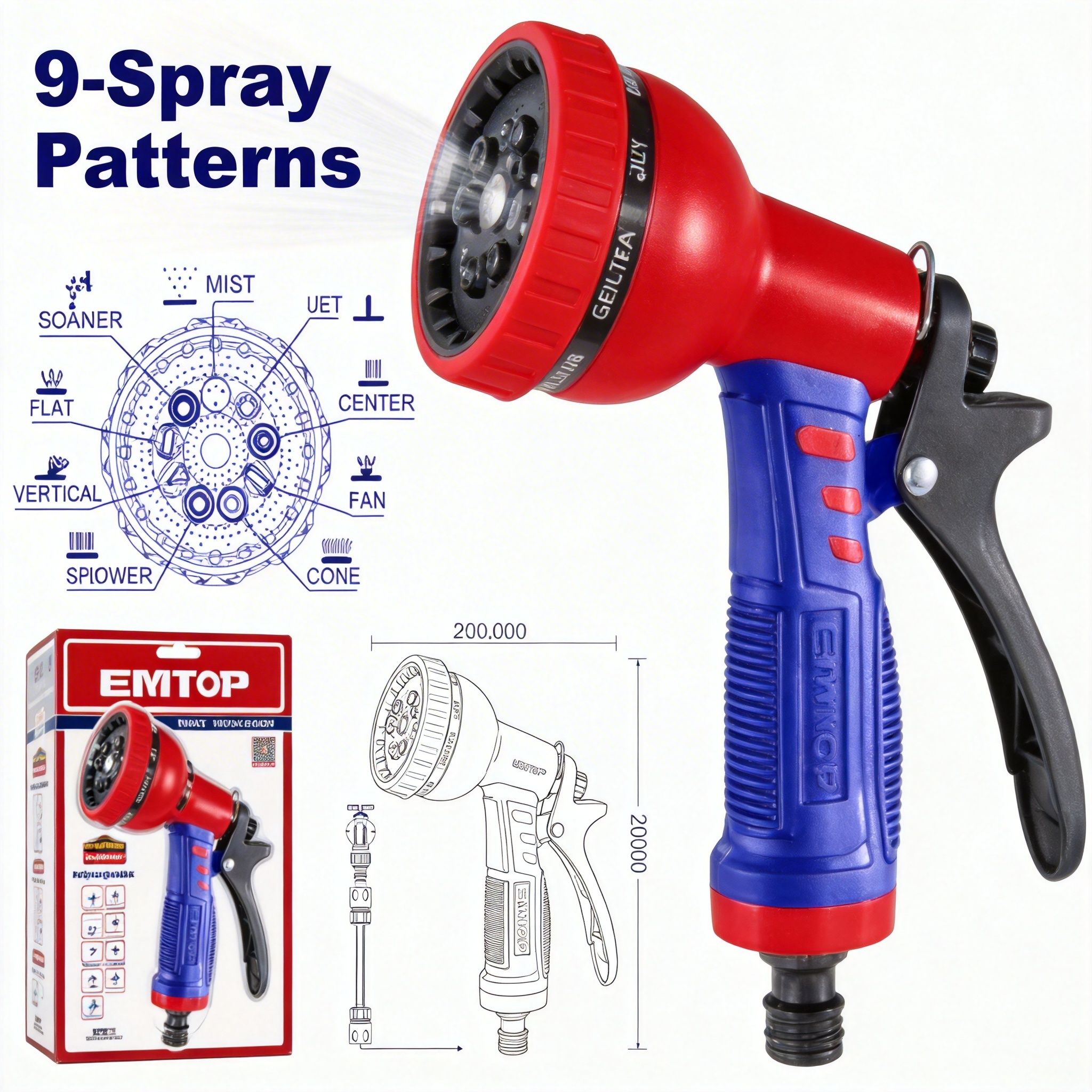 La boquilla de gatillo de plástico con 9 funciones es un accesorio práctico y versátil para tareas de riego, limpieza y mantenimiento en el hogar, jardín o áreas de trabajo. Está diseñada para ofrecer diferentes tipos de salida de agua, permitiendo adaptar el flujo según la necesidad de cada tarea, ya sea para regar plantas, lavar superficies, limpiar patios, enjuagar herramientas o realizar trabajos de uso general.