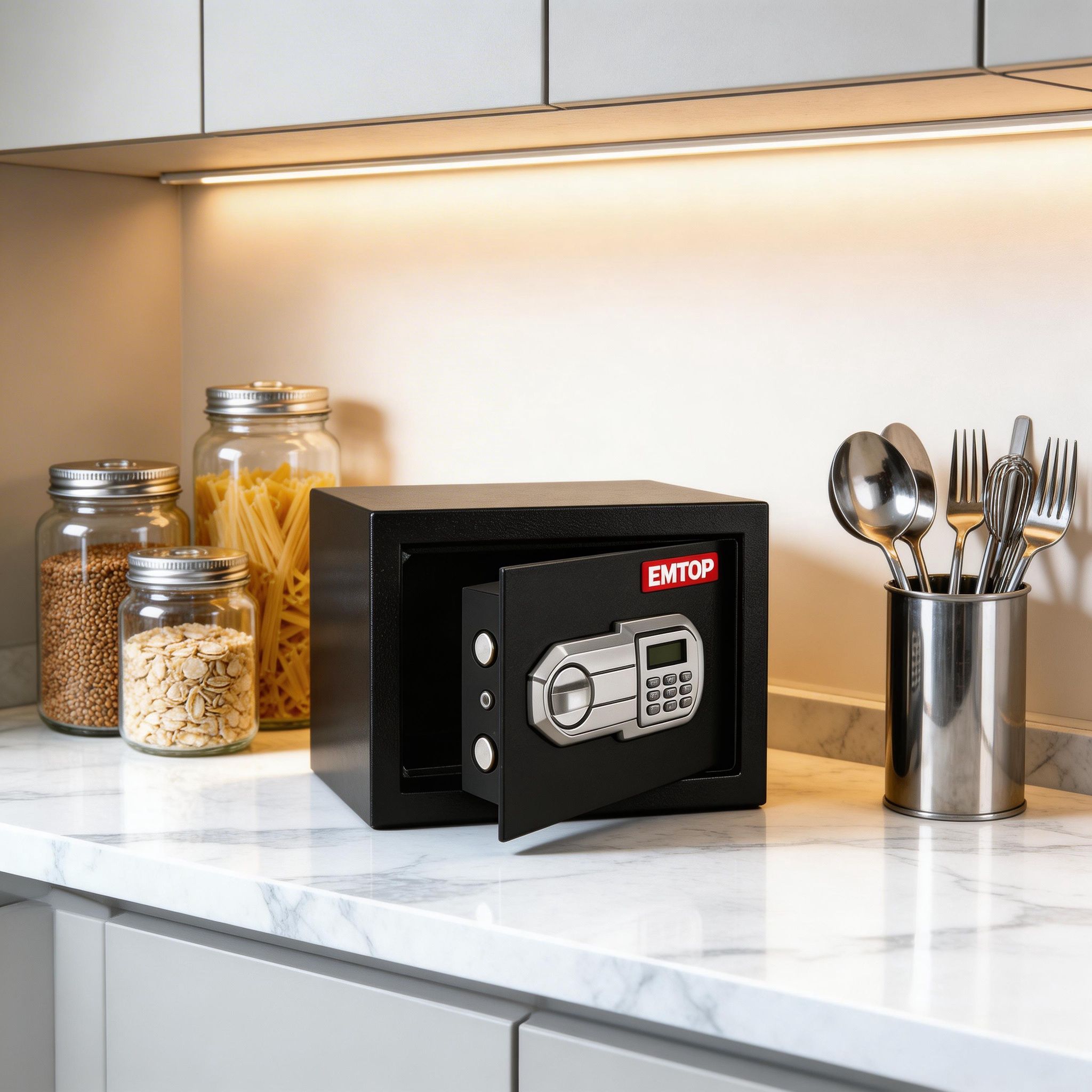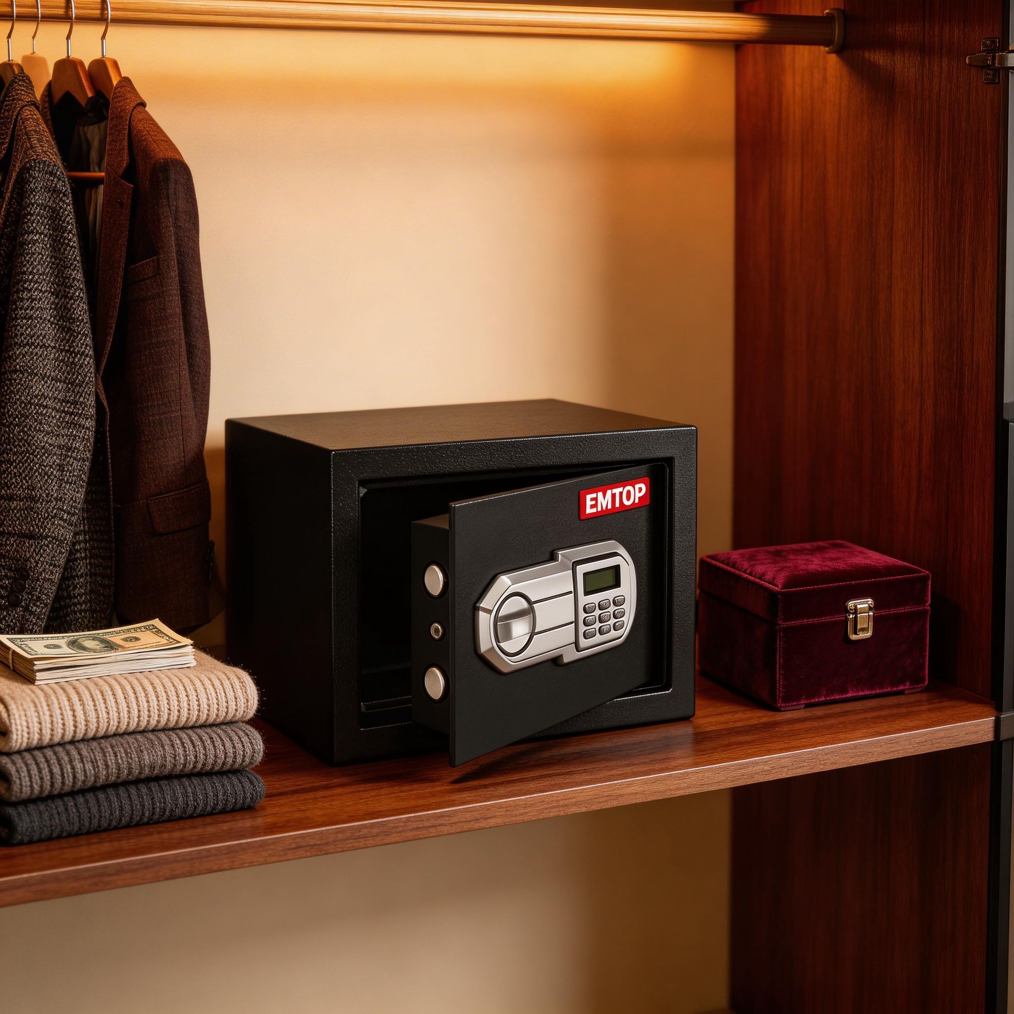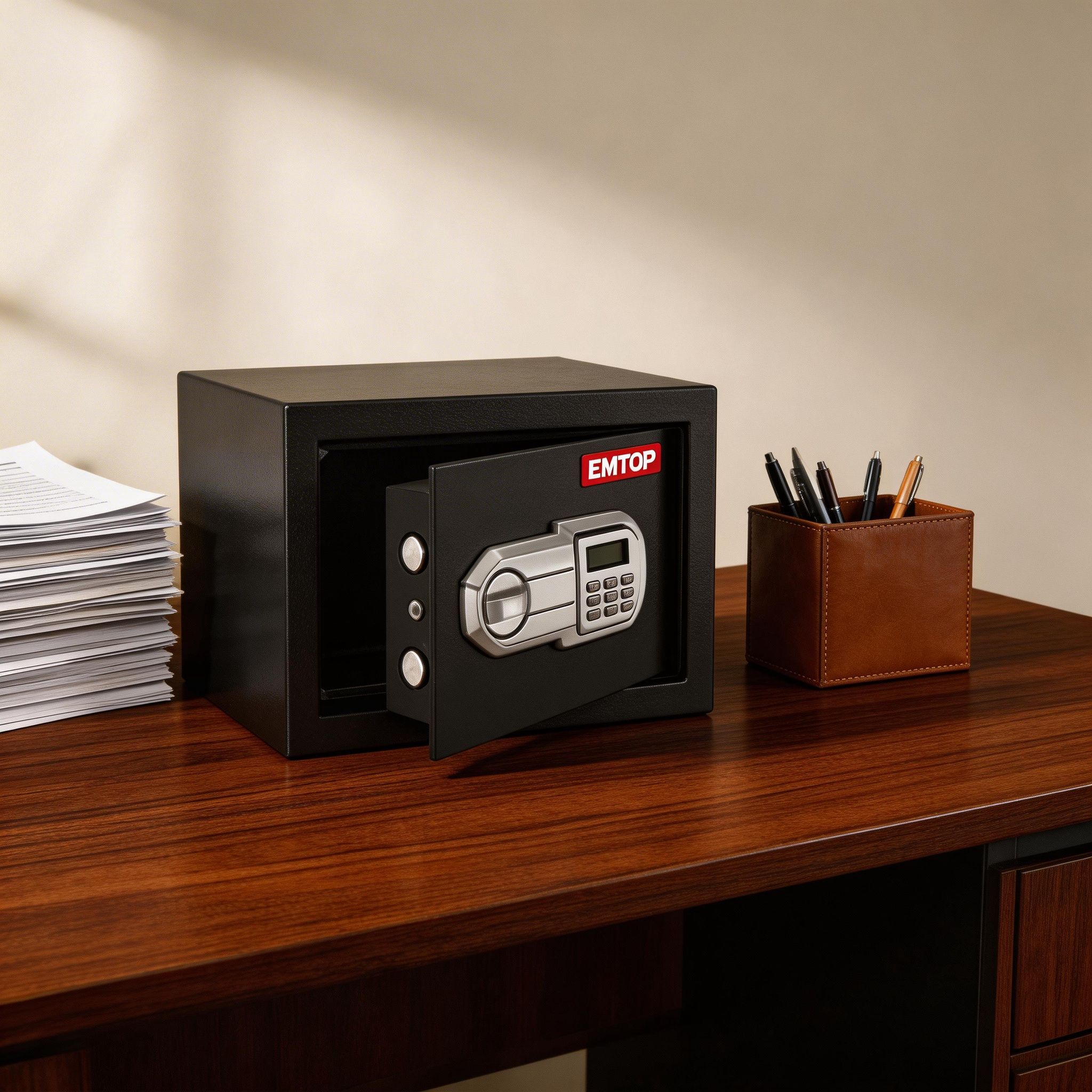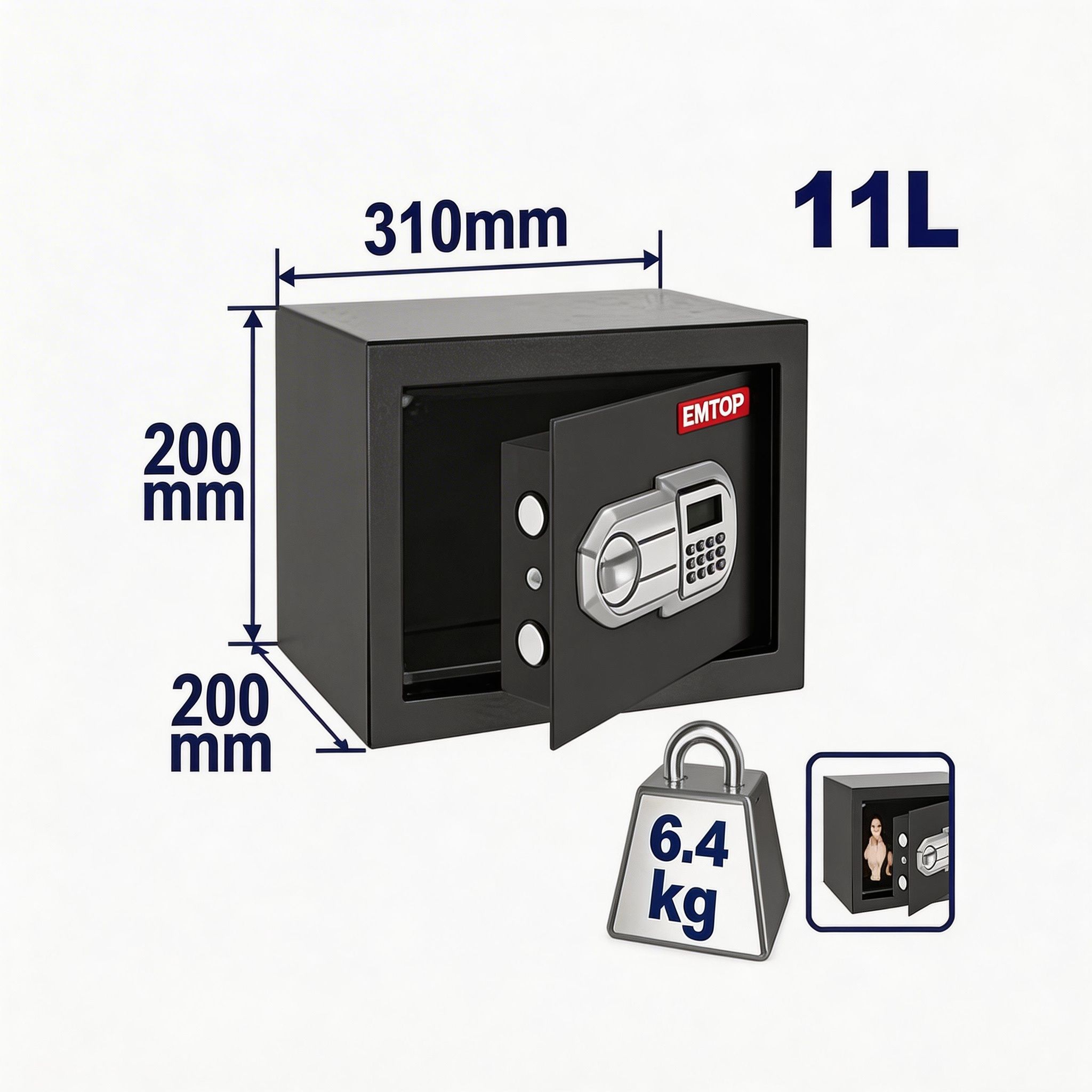La caja fuerte electrónica EMTOP de 11 litros es una opción práctica y segura para resguardar dinero, documentos, llaves, joyas y otros objetos de valor en casa, oficina, negocio o habitación. Su tamaño compacto permite colocarla con facilidad en diferentes espacios sin ocupar demasiado lugar, convirtiéndola en una excelente alternativa para quienes buscan una solución discreta y funcional para proteger sus pertenencias importantes.