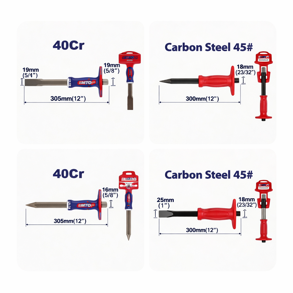 La línea de cinceles EMTOP está diseñada para trabajos de demolición, remoción de material, apertura de ranuras, ajustes en obra y labores generales de construcción donde se requiere una herramienta de golpe resistente y confiable. Este grupo incluye cincel de frío y cincel para concreto en dos presentaciones distintas, ofreciendo opciones adecuadas para diferentes tipos de aplicación y preferencia de material. Son herramientas muy útiles para albañiles, técnicos, maestros de obra y usuarios que necesitan realizar trabajos de corte, desprendimiento o ruptura en materiales duros.