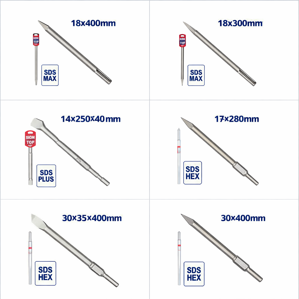 Son ideales para profesionales de la construcción, instaladores, personal de mantenimiento y usuarios que trabajan con martillos demoledores o rotomartillos compatibles en tareas frecuentes de demolición, ranurado, apertura y remoción de concreto o materiales similares. Gracias a sus diferentes medidas y formatos, permiten elegir la opción más adecuada según la profundidad, el alcance y el tipo de trabajo que se va a realizar, ya sea con punta, pala o formato hexagonal.