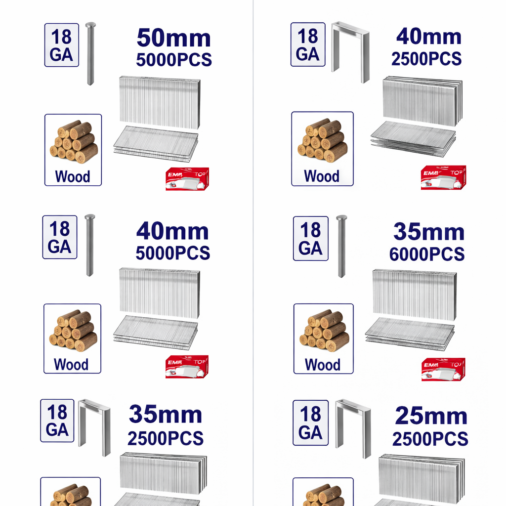Los clavos brad y grapas crown EMTOP 18GA son accesorios prácticos para trabajos de fijación en madera, ideales para tareas de carpintería, instalación, fabricación de muebles, tapicería ligera, acabados y proyectos de ensamblaje. Su variedad de medidas permite elegir la opción más adecuada según el tipo de trabajo, el grosor del material y el nivel de sujeción que se necesite en cada aplicación.