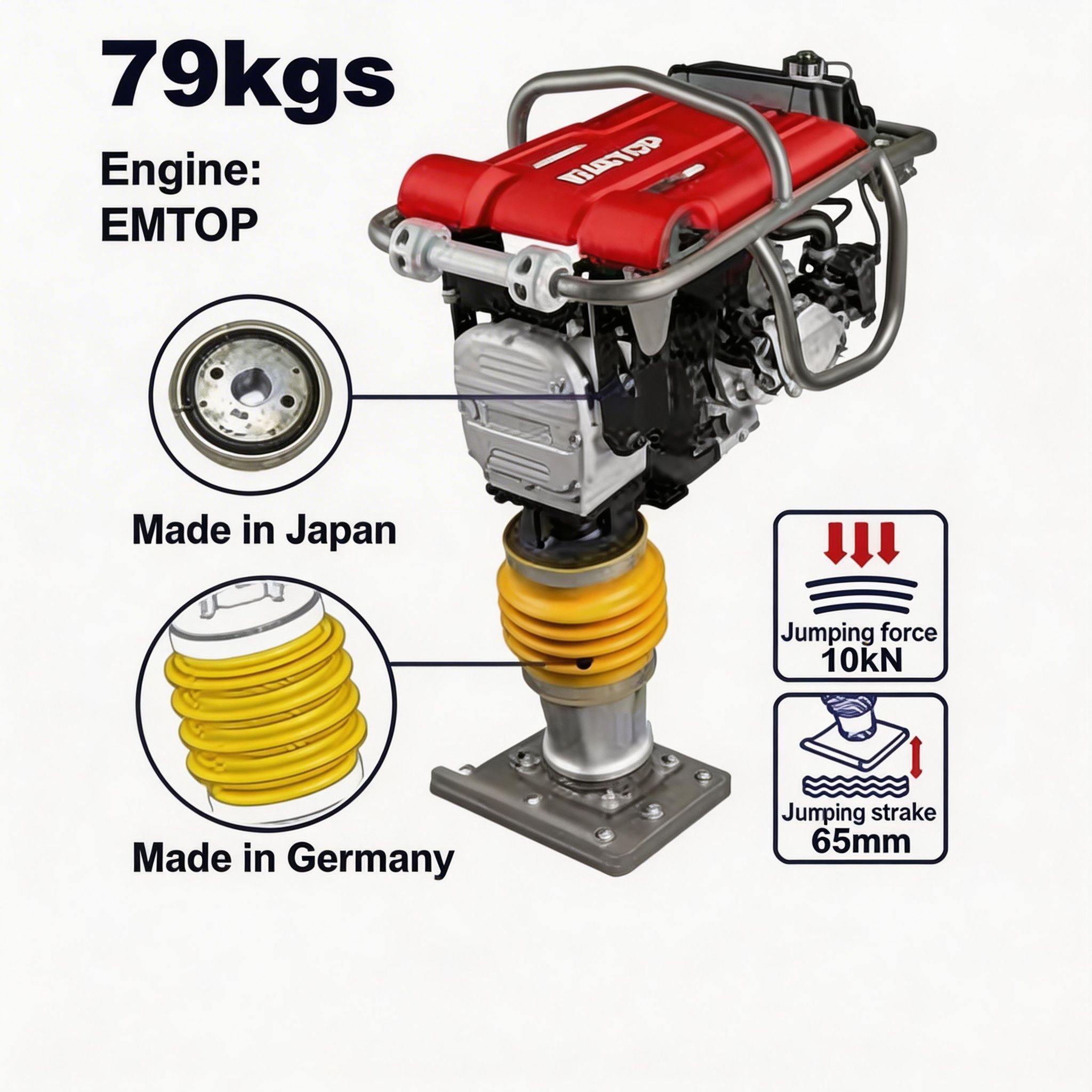 La compactadora tipo canguro EMTOP de 79 kg está diseñada para trabajos de compactación en superficies de tierra, arena, relleno y otros materiales compatibles, siendo una opción práctica para labores de construcción, instalación, obra civil y mantenimiento. Su formato a gasolina permite trabajar con mayor independencia en áreas donde se necesita movilidad y fuerza de compactación sin depender de una conexión eléctrica.