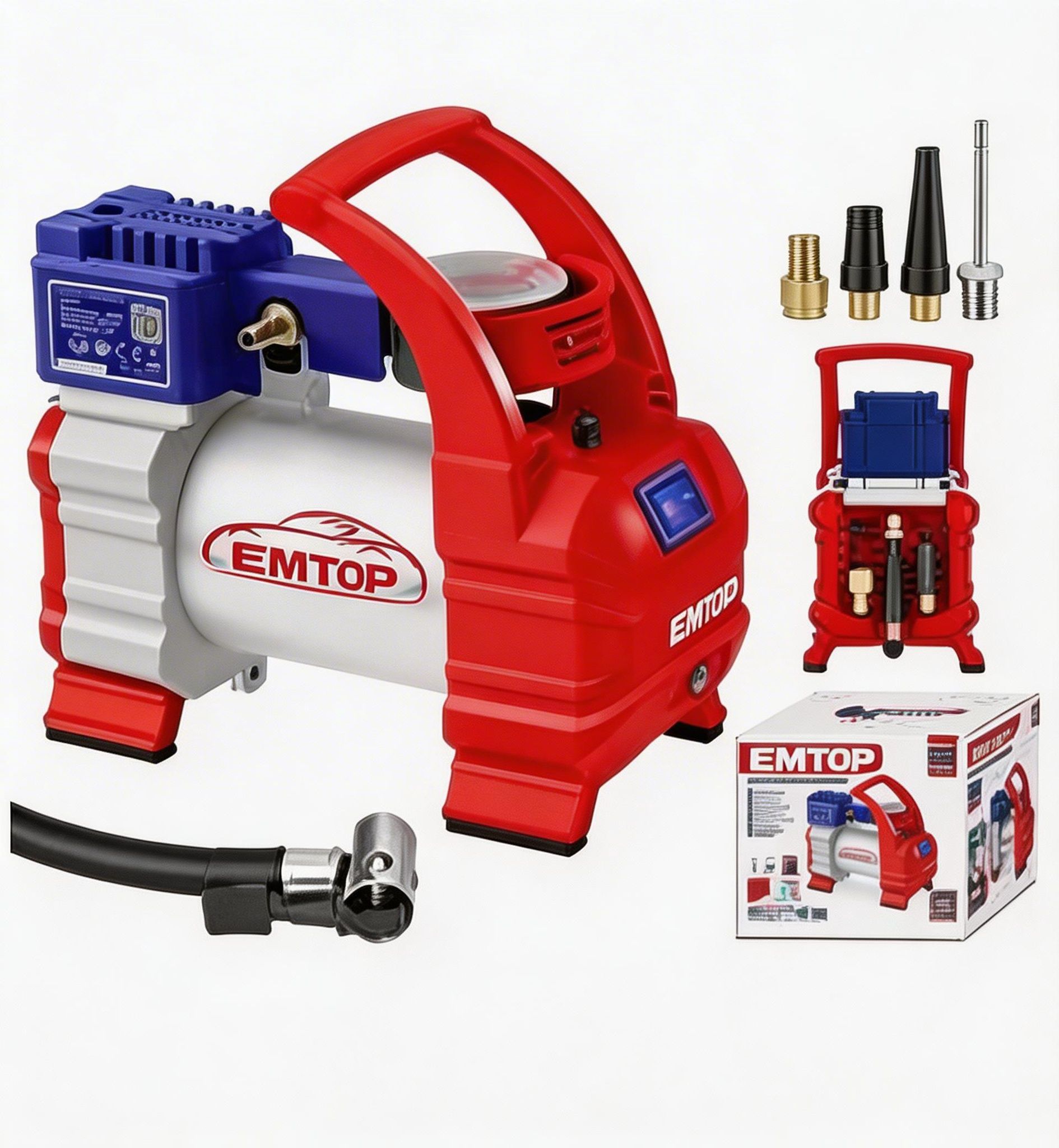 Este compresor de aire portátil EMTOP es una herramienta práctica diseñada para mantener la presión adecuada de las llantas en todo momento, siendo ideal para uso en automóvil, motocicleta, bicicleta y otros inflables. Su tamaño compacto permite guardarlo fácilmente en el vehículo, convirtiéndolo en un accesorio indispensable para viajes, emergencias o uso diario.