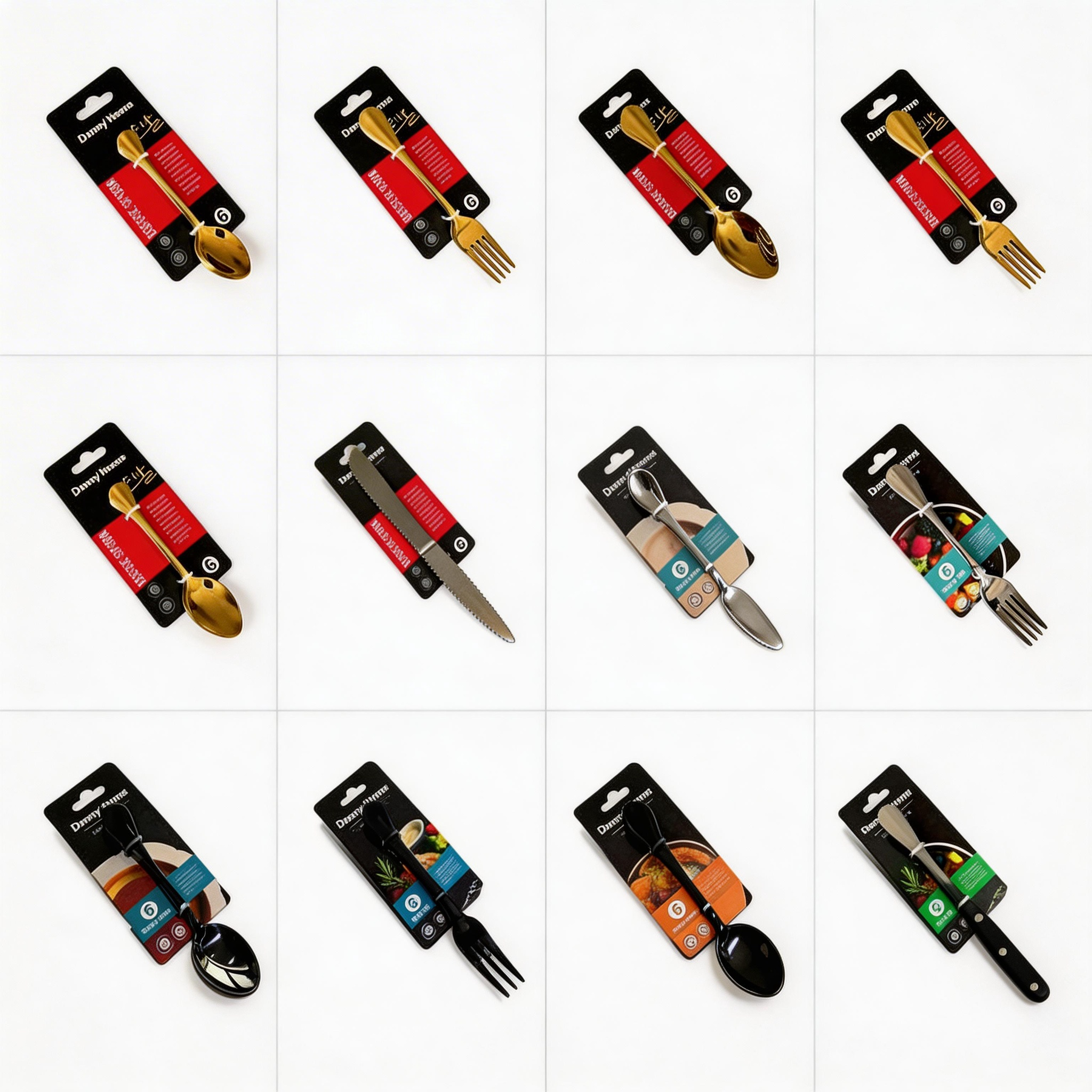 Fabricados con acero inoxidable resistente, algunos modelos con acabado tipo titanio, estos cubiertos garantizan durabilidad, resistencia a la corrosión y facilidad de limpieza. Su diseño ergonómico permite un agarre cómodo y seguro.
