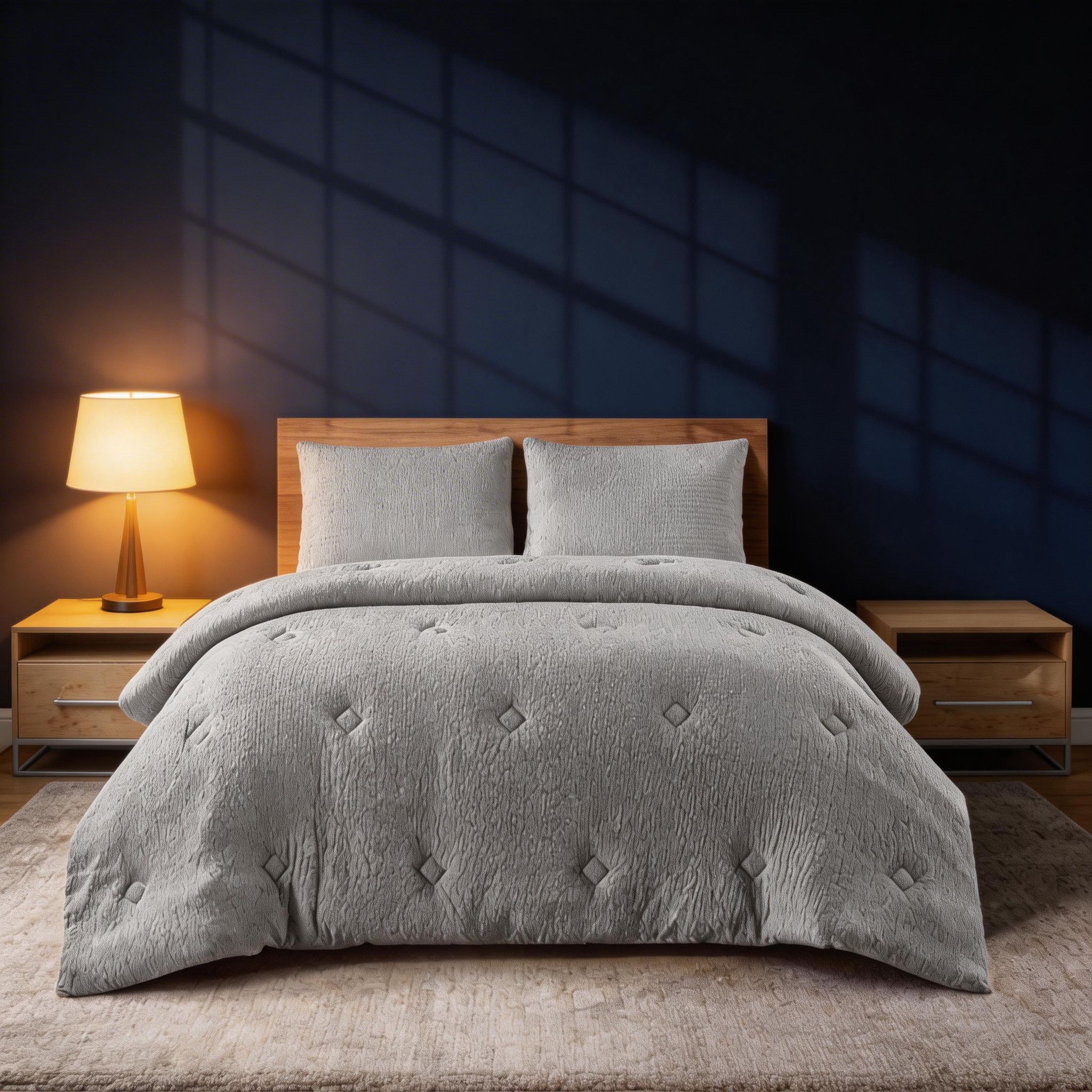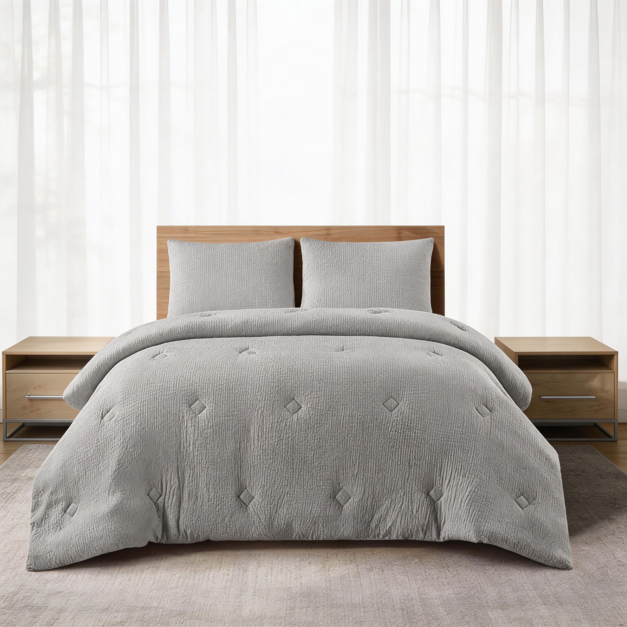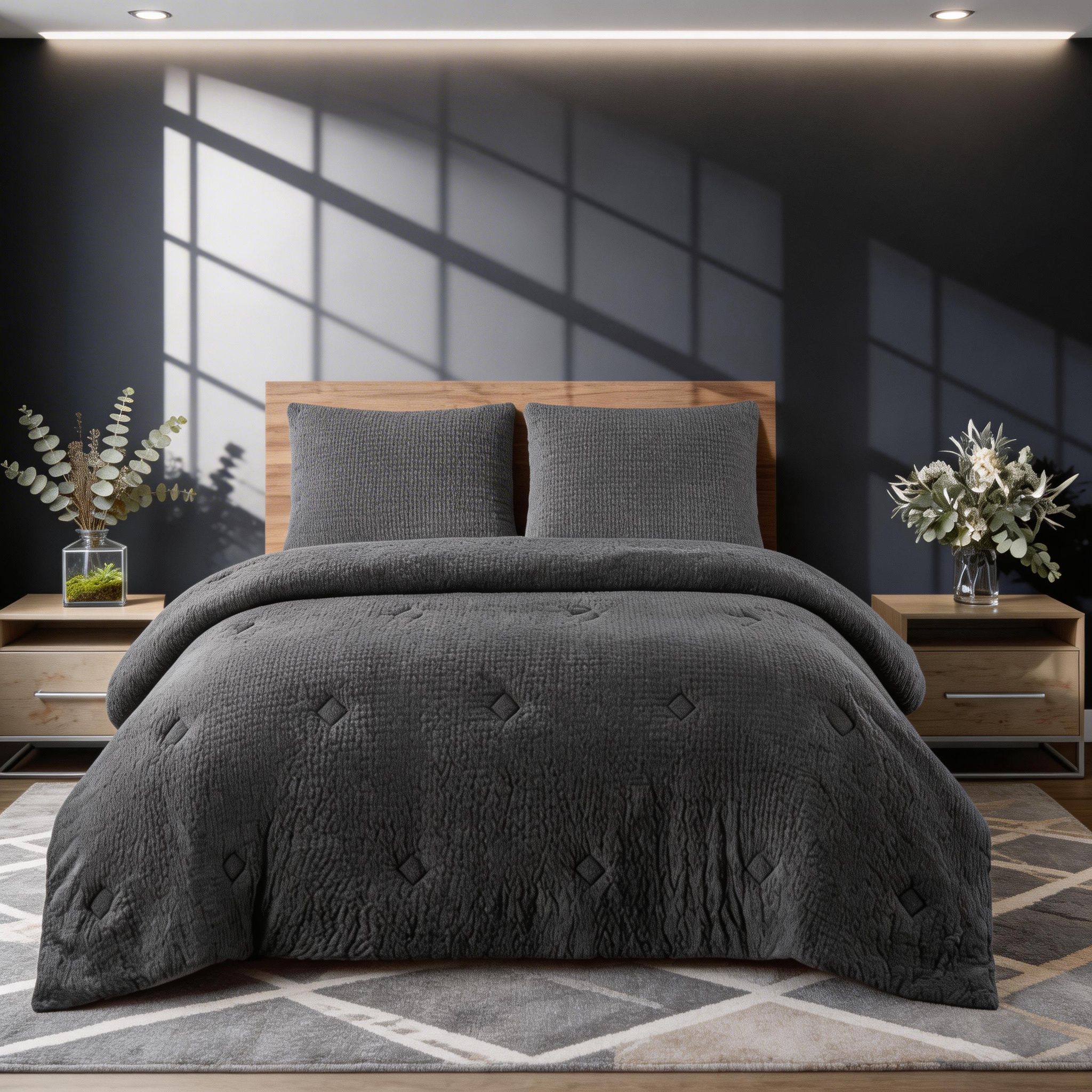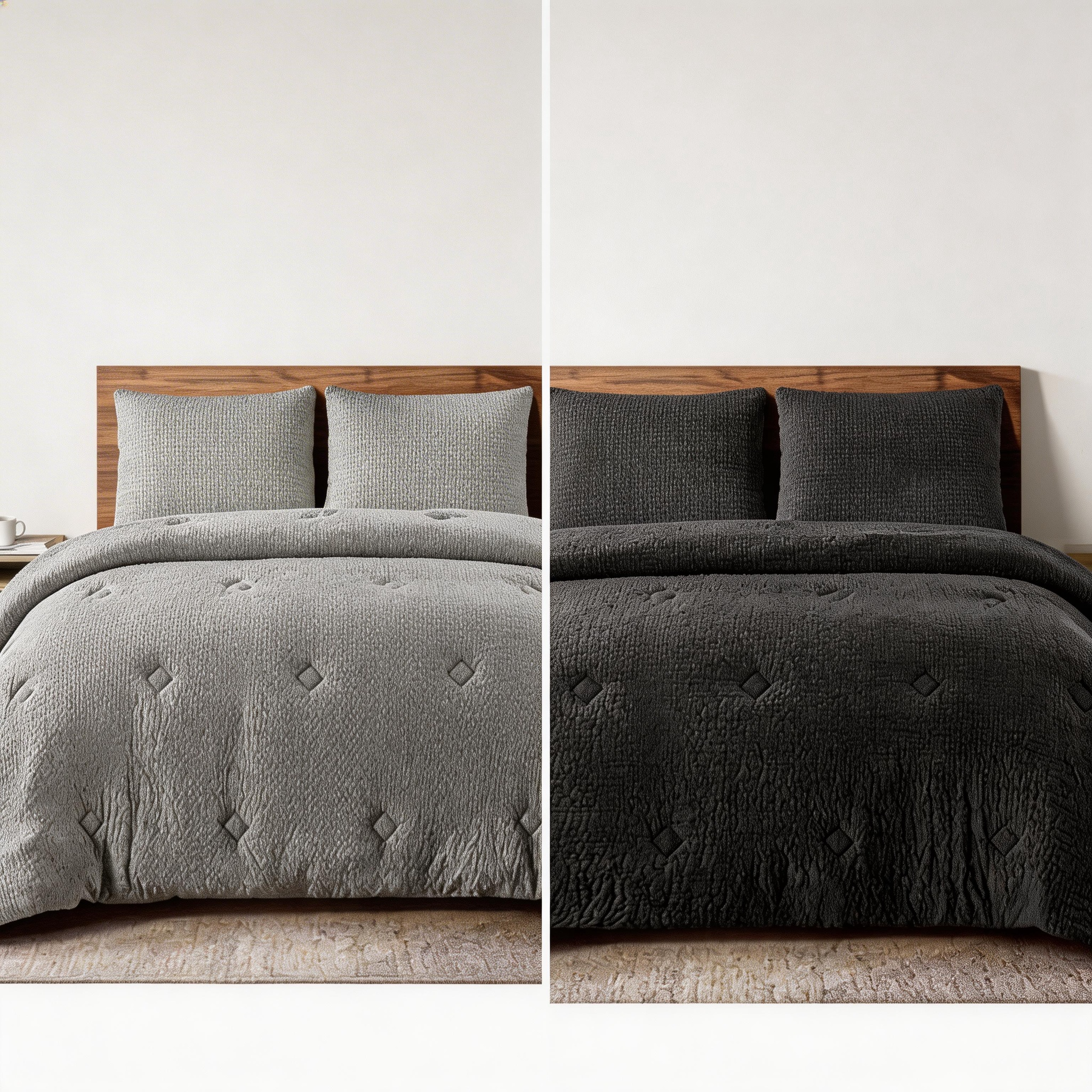Dale elegancia y confort a tu dormitorio con estos edredones de 2 y 3 piezas en colores modernos Carbón y Gris Claro. Incluyen fundas a juego que aportan practicidad y armonía en la decoración de tu cama, cubriendo tamaños desde individuales hasta King o Queen según el modelo.