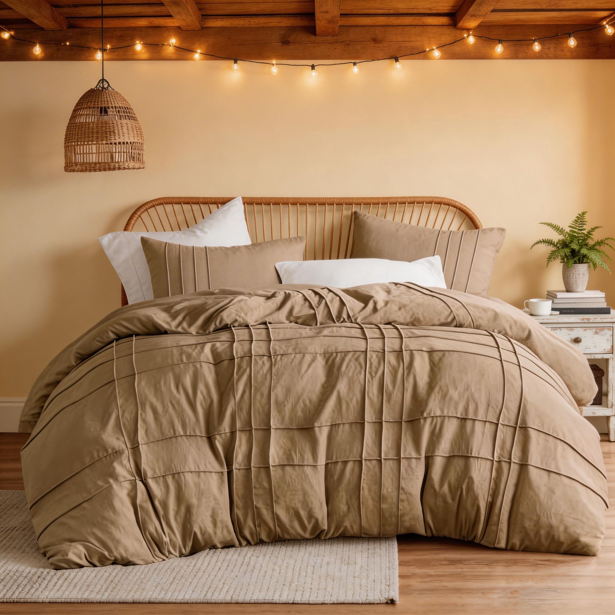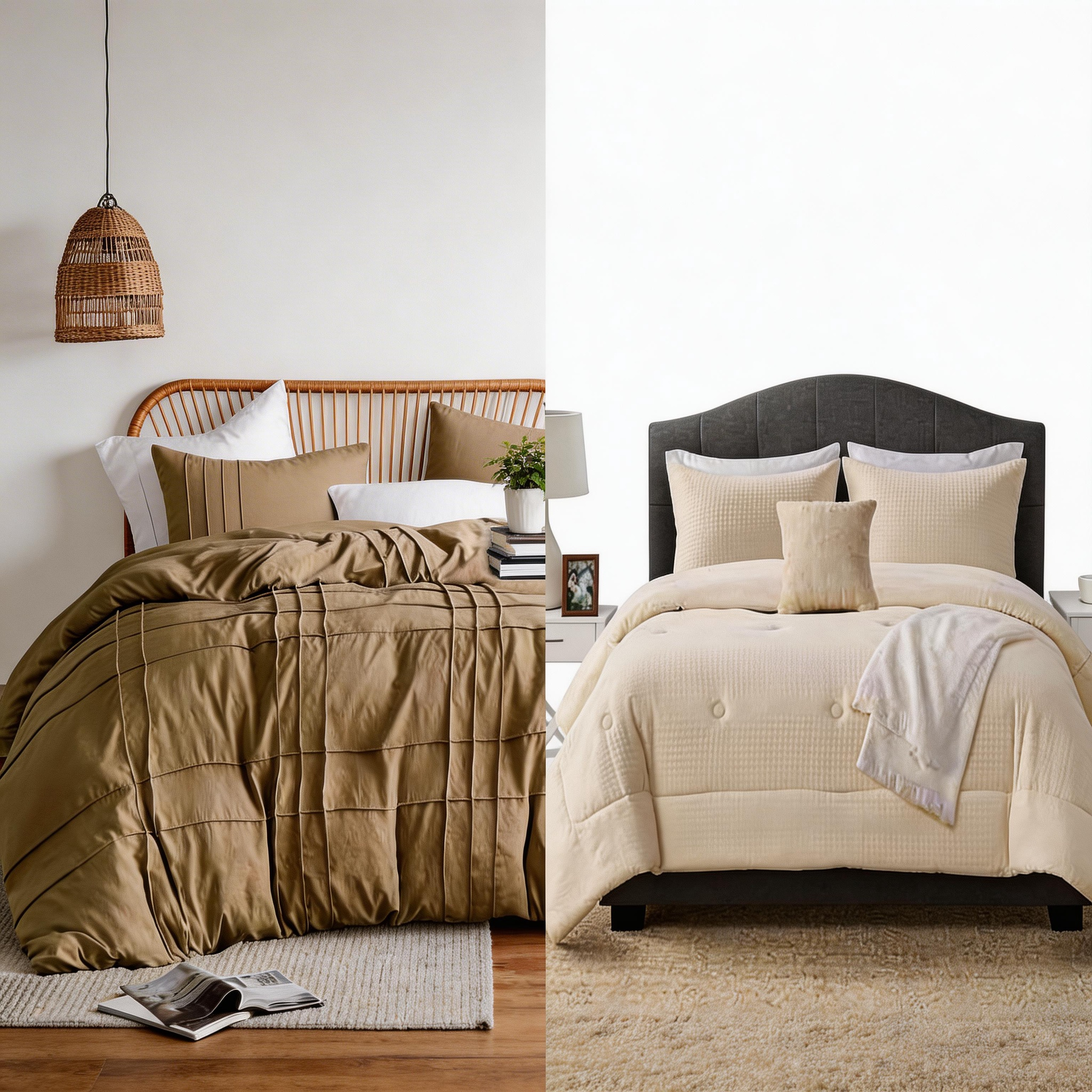 Renueva tu dormitorio con estos elegantes edredones de 2 y 3 piezas en tonos Natural y Oscuro. Incluyen fundas a juego en la mayoría de los modelos, combinando comodidad y estilo, adaptándose a diferentes tamaños de cama desde individuales hasta King o Queen según el modelo.