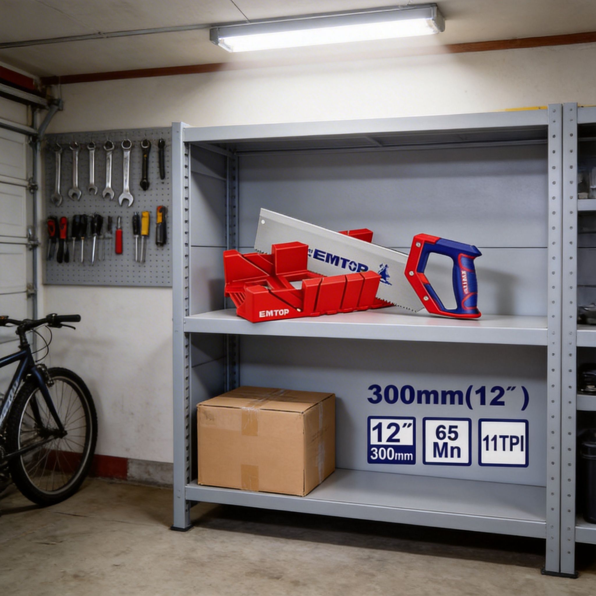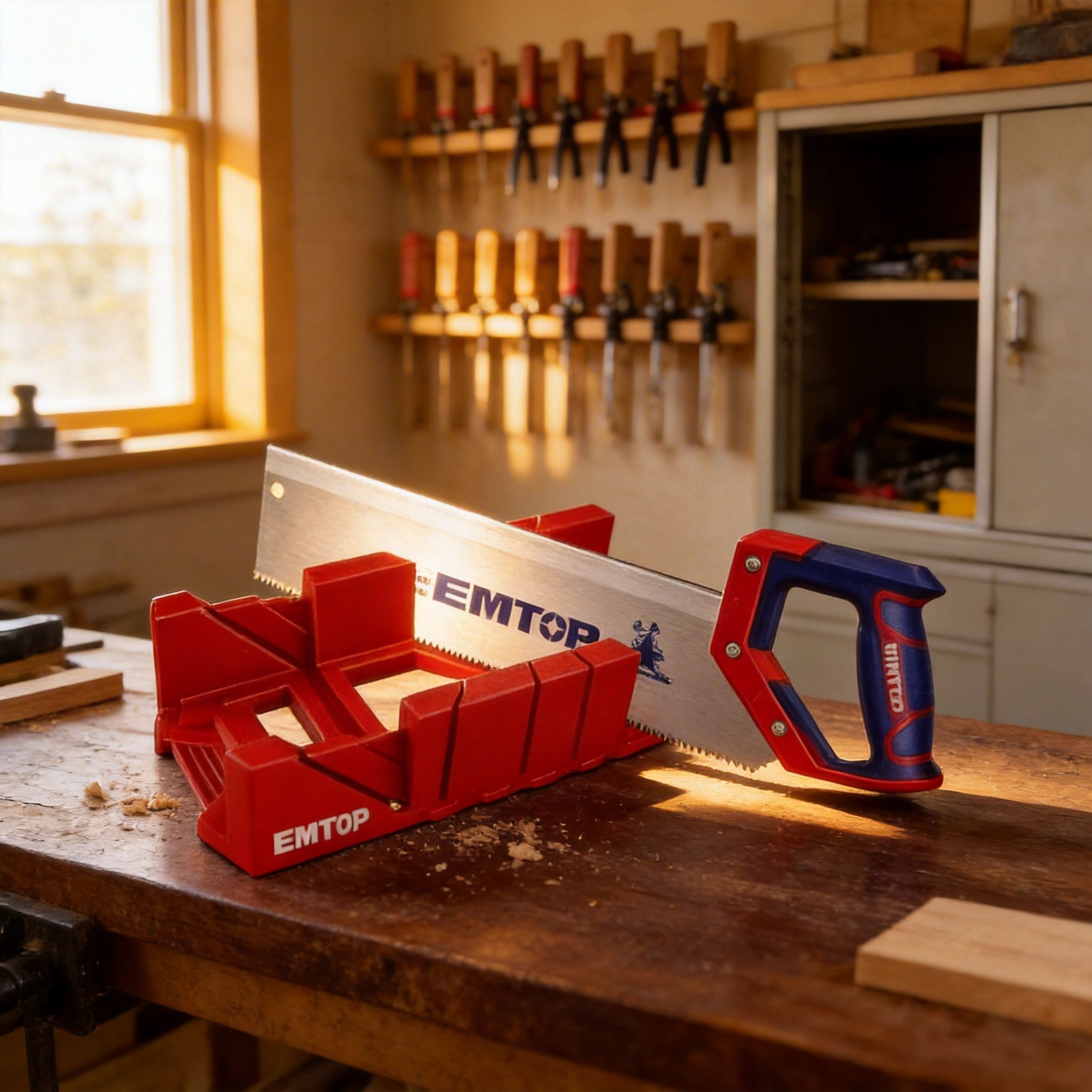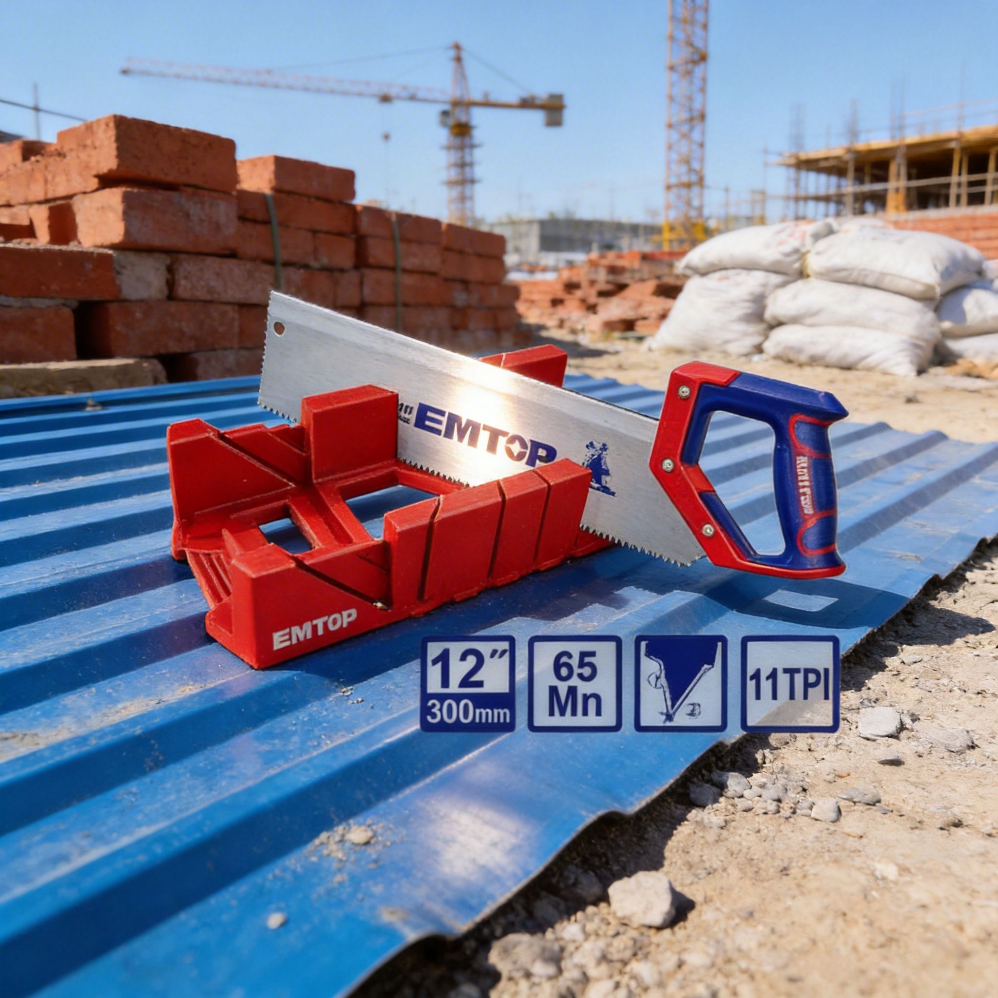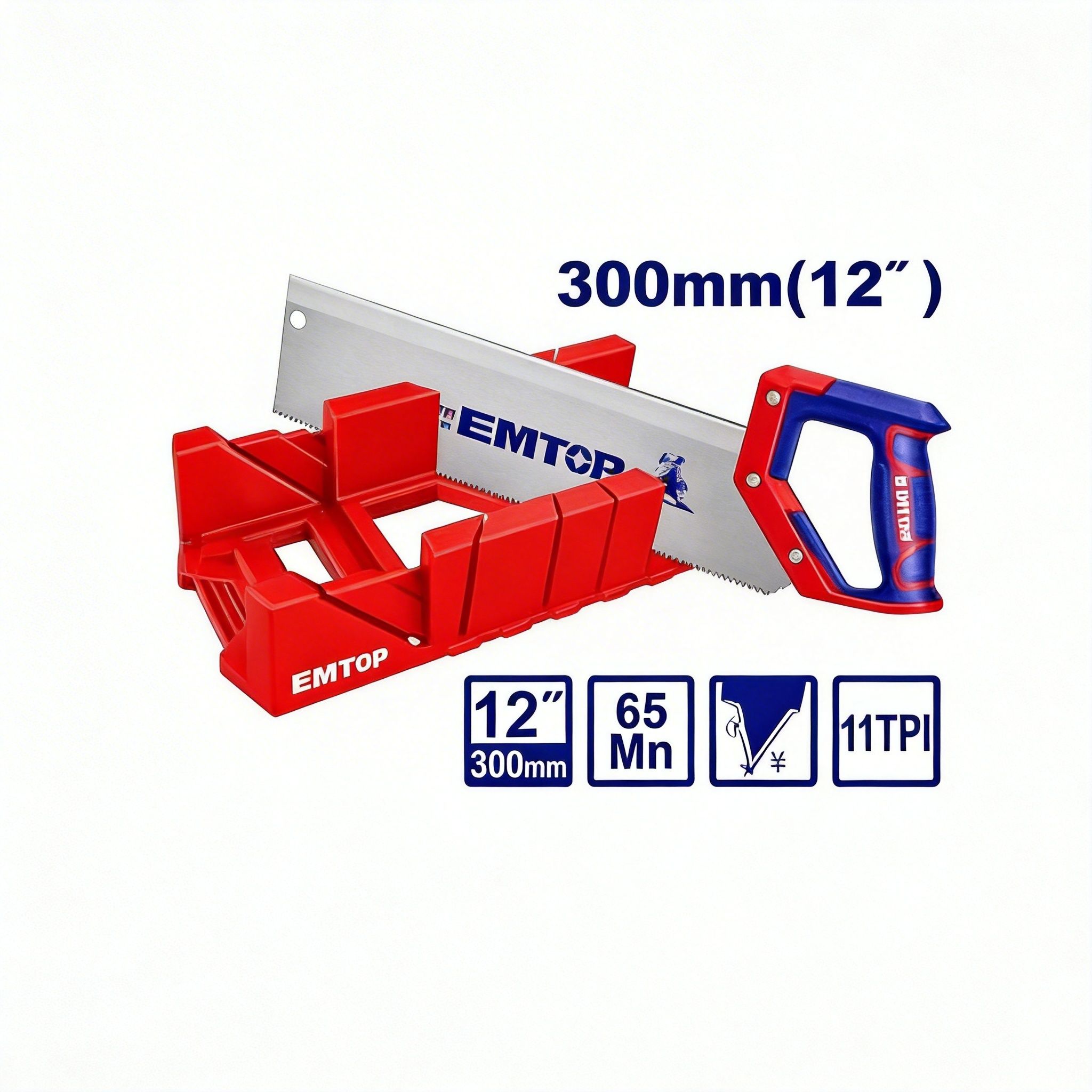 Juego de caja de inglete y serrucho EMTOP de 300 mm (12″), ideal para realizar cortes guiados con mayor precisión en trabajos de carpintería, instalación, bricolaje y mantenimiento. Este set es una opción práctica para quienes necesitan hacer cortes rectos o en ángulo de forma más ordenada, ayudando a mejorar el acabado en piezas de madera, molduras, listones y otros materiales ligeros según la aplicación.