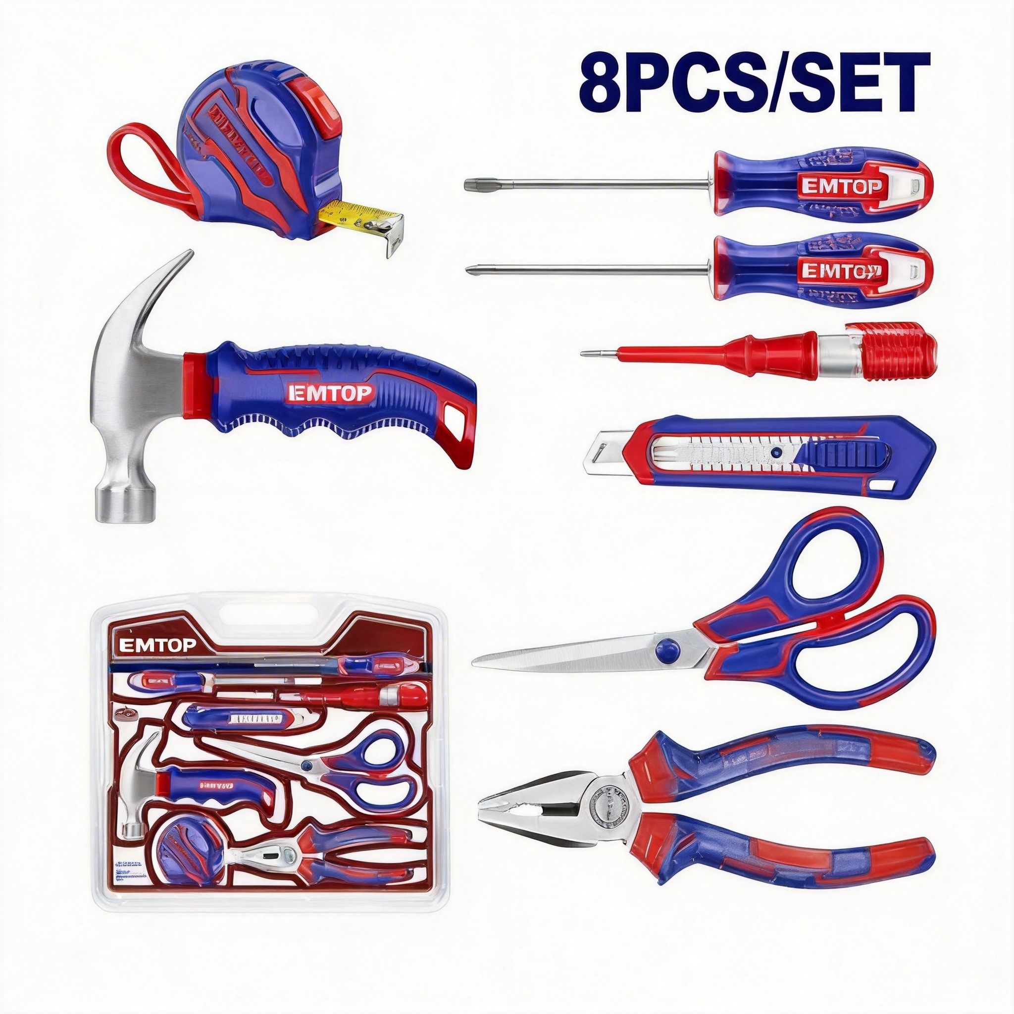 Juego de herramientas manuales EMTOP de 8 piezas, ideal para tareas básicas de instalación, reparación, ajuste y mantenimiento en el hogar, taller o trabajo técnico. Este set ofrece una selección práctica de herramientas de uso frecuente, convirtiéndose en una opción conveniente para quienes buscan resolver diferentes trabajos con un solo producto compacto y funcional.