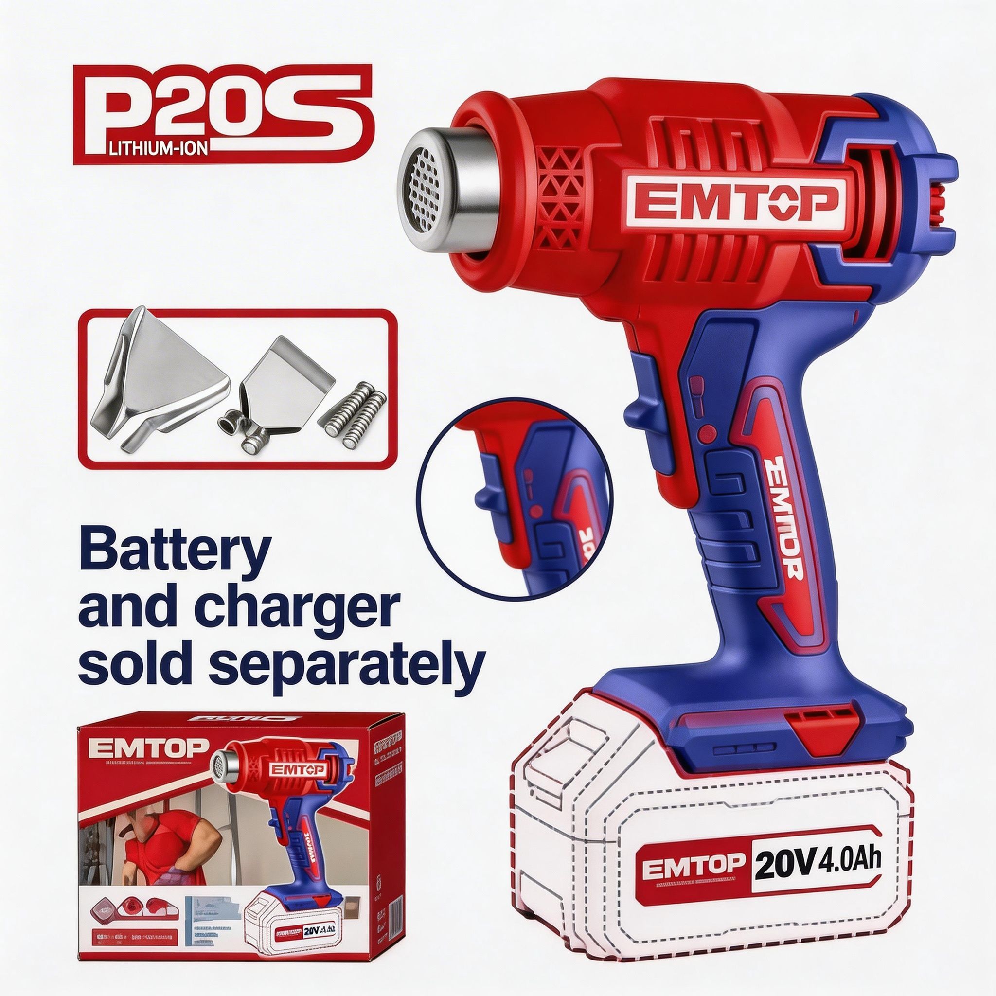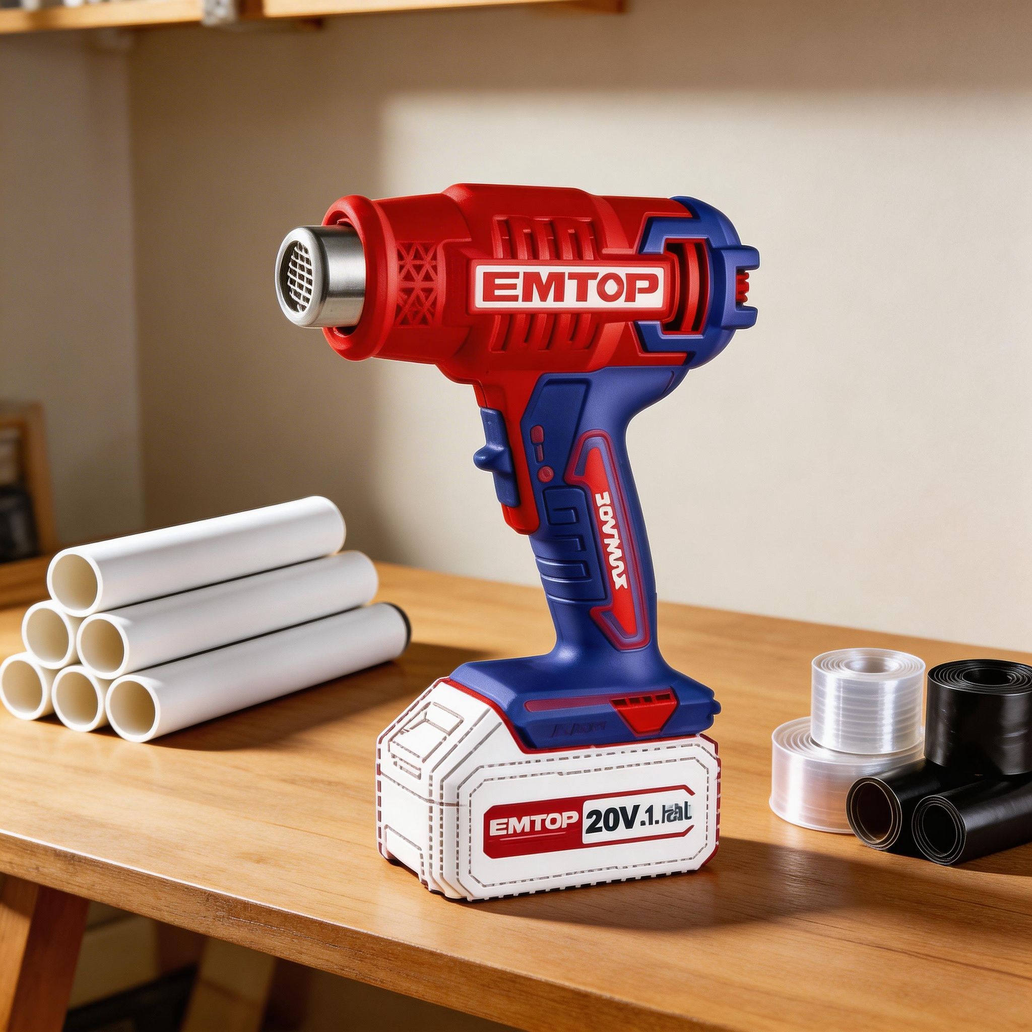 Esta pistola de calor inalámbrica EMTOP está diseñada para trabajos de aplicación térmica como remover pintura, encoger tubos, secar superficies y moldear materiales. Es una herramienta práctica y versátil, ideal para uso en bricolaje, mantenimiento y aplicaciones técnicas donde se requiere calor controlado.