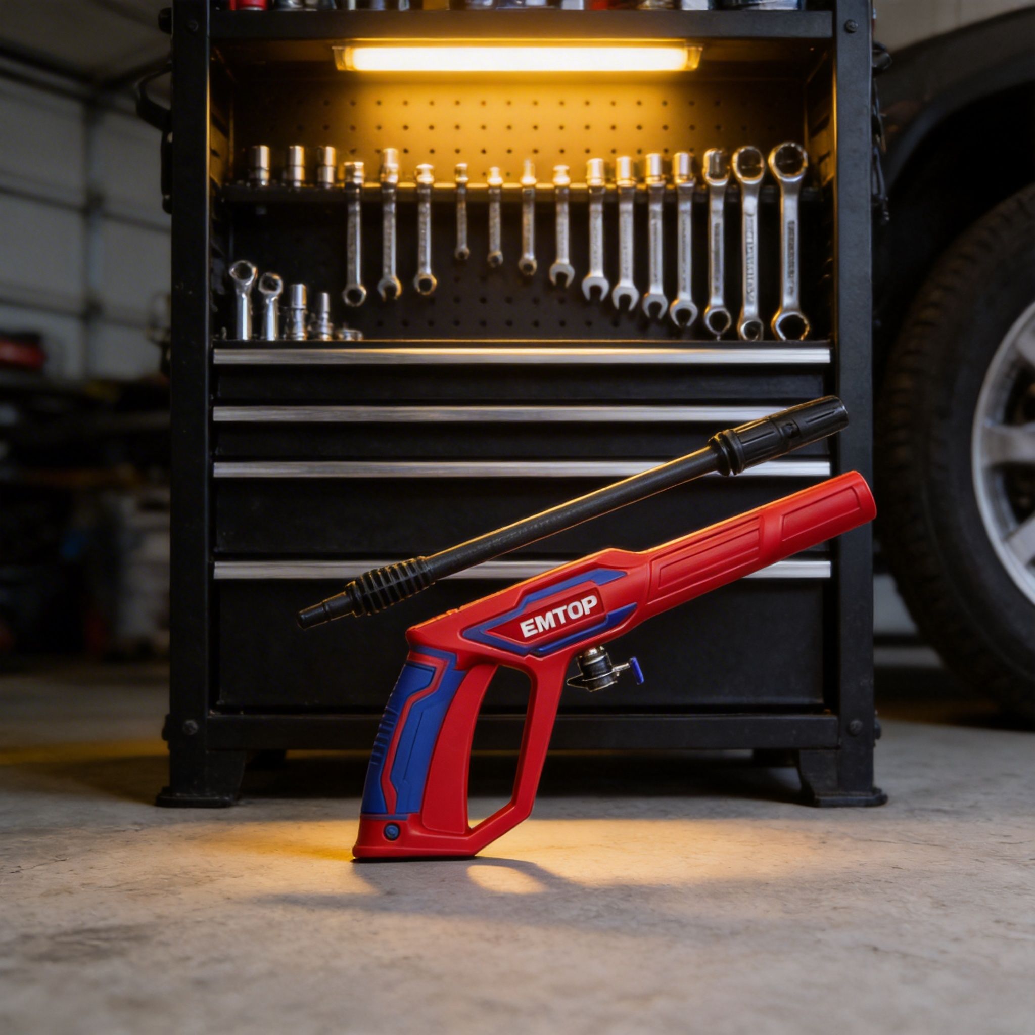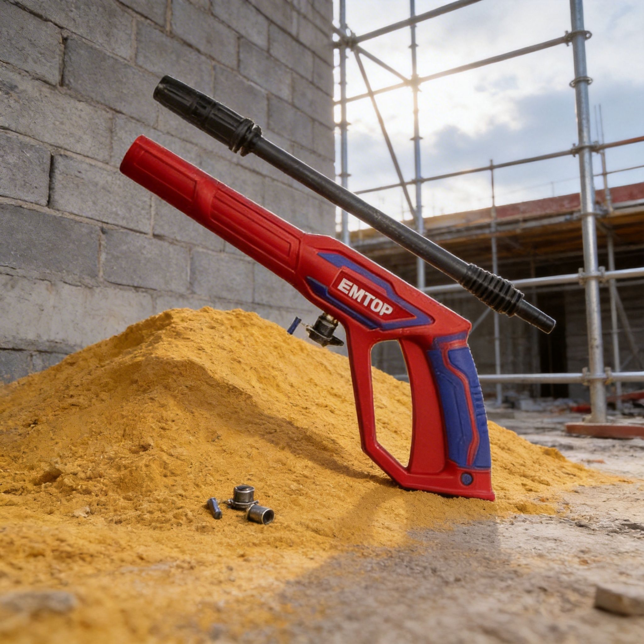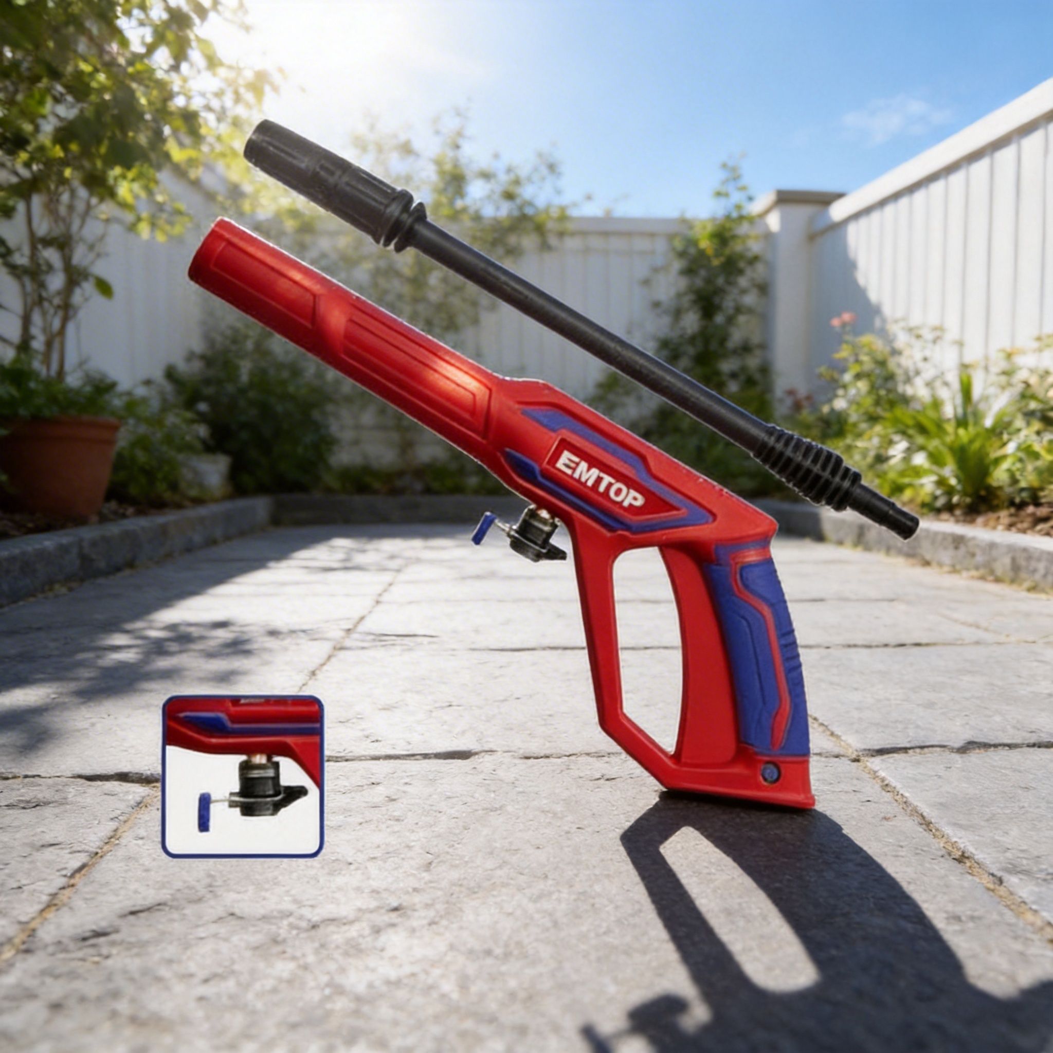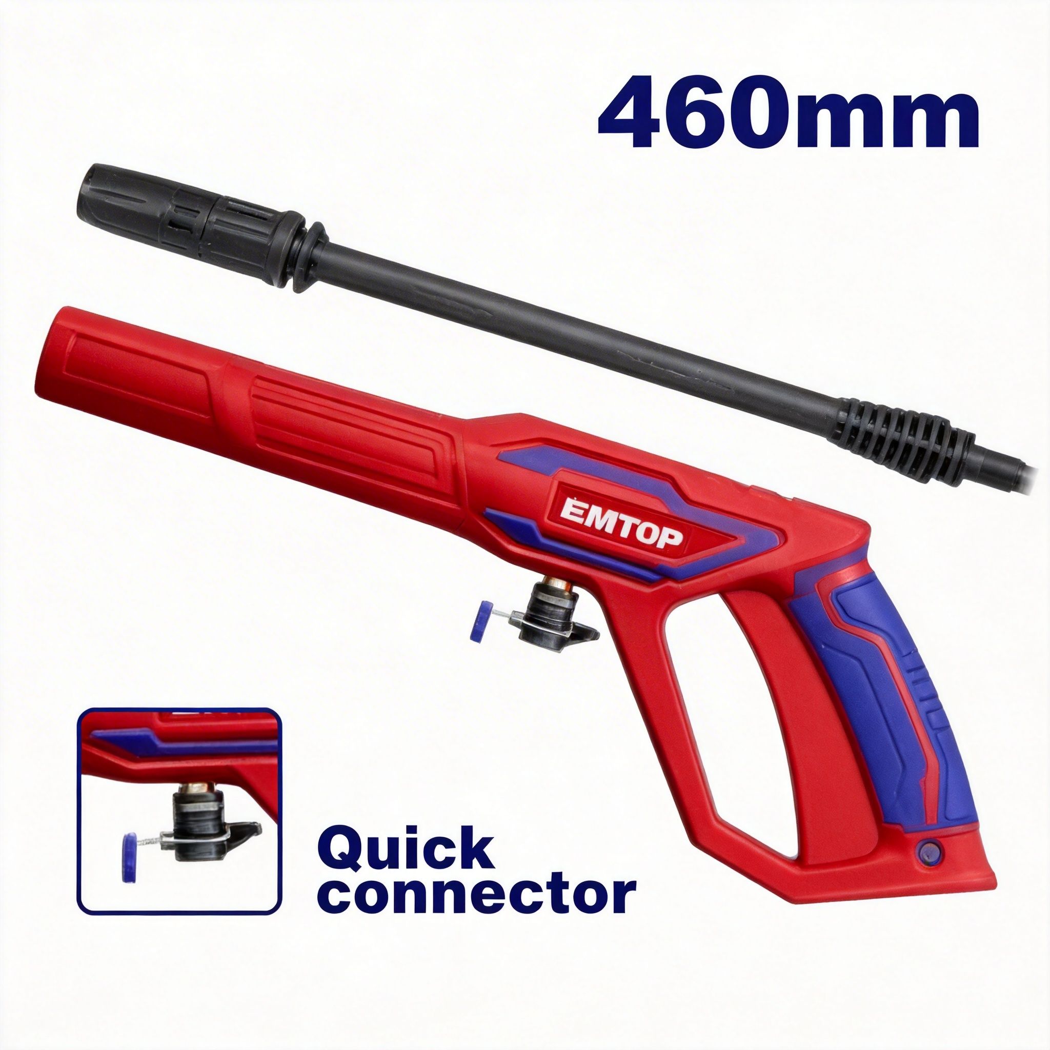 Pistola de pulverización EMTOP de 460 mm con conector rápido, también conocida como pistola para hidrolavadora, ideal para trabajos de limpieza y lavado a presión en diferentes superficies. Es una herramienta práctica para dirigir el flujo de agua con mayor control, facilitando tareas de limpieza en vehículos, patios, pisos, paredes, herramientas, jardines y áreas exteriores.