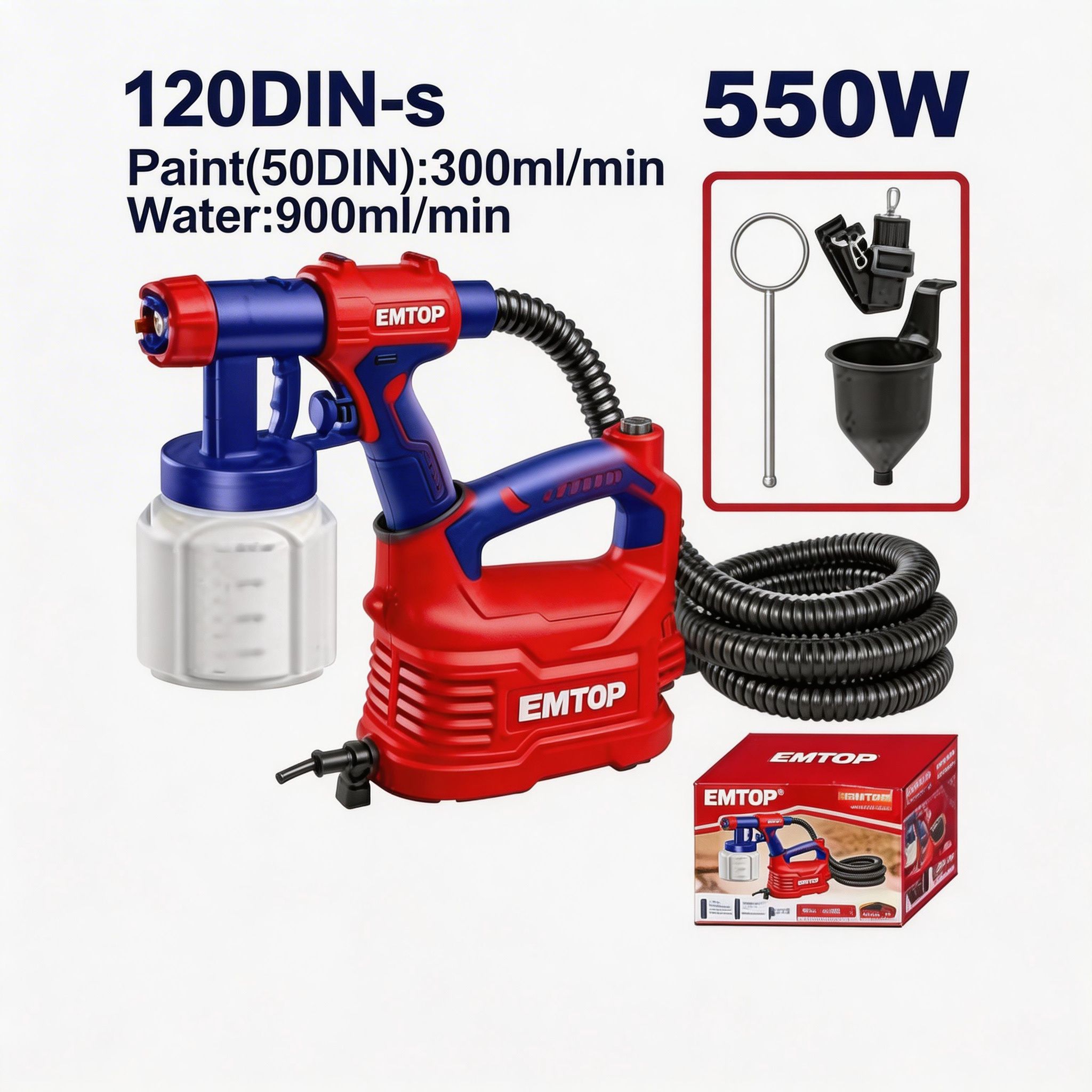La pistola para pintar eléctrica EMTOP de 550W está diseñada para facilitar trabajos de pintura con una aplicación más práctica, uniforme y eficiente en diferentes superficies. Es una opción funcional para proyectos de hogar, mantenimiento, decoración y trabajos generales donde se busca una mejor distribución de pintura con mayor comodidad que los métodos manuales tradicionales.