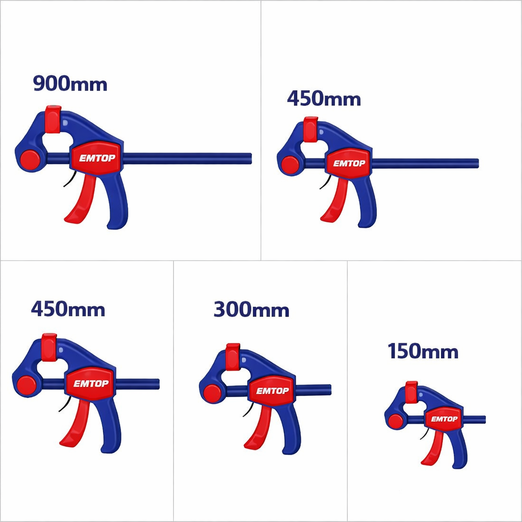 La línea de prensas rápidas de barra EMTOP está diseñada para sujetar piezas de forma firme, práctica y eficiente en trabajos de carpintería, ensamblaje, instalación, taller y bricolaje. Este grupo incluye varias medidas de barra, permitiendo elegir la opción más adecuada según el tamaño de la pieza y la fuerza de sujeción que se necesita. Son herramientas muy útiles para mantener materiales en posición mientras se pegan, ajustan, perforan, cortan o ensamblan, ayudando a trabajar con mayor precisión, estabilidad y comodidad.