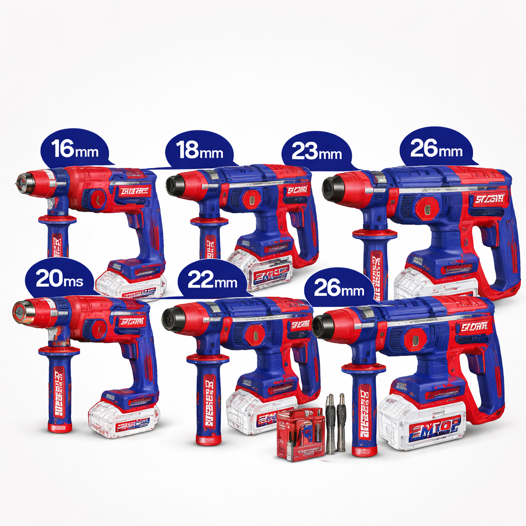 Esta línea de rotomartillos inalámbricos P20S está diseñada para trabajos de perforación y demolición ligera en diferentes superficies, ofreciendo potencia, movilidad y practicidad para uso técnico, profesional y de construcción. Su diseño inalámbrico permite trabajar con mayor libertad en distintas áreas sin depender de cables, facilitando tareas de instalación, mantenimiento y obra.