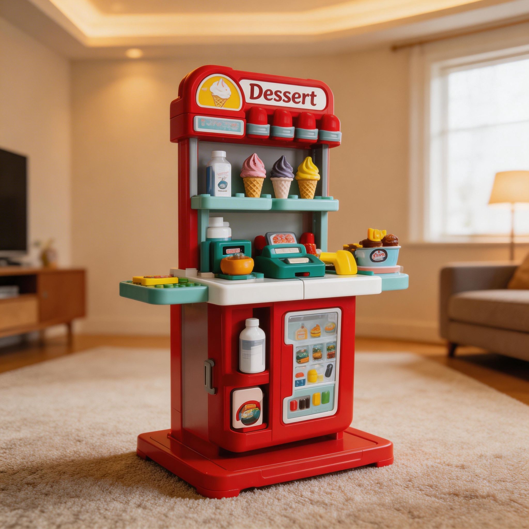 Fabricada con materiales seguros y resistentes, esta tienda está diseñada para un uso prolongado y cómodo para los pequeños. Ayuda a desarrollar la coordinación mano-ojo, la motricidad fina y la capacidad de organización, mientras los niños simulan la venta y preparación de deliciosos postres.